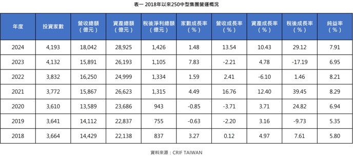 2024年全球總經持穩上行,據國際貨幣基金組織(IMF)數據統計2024年全球經濟成長率為3.2%,而美國民間消費支出強勁,伴隨Fed降息支撐上升力道達2.8%、中國以超長期國債擴內需促消費,達5%經濟成長率、東南亞十一國平均成長達4.8%等國際擴張格局刺激終端消費復甦,帶動台灣以5.27%經濟成長支撐中型集團總體經營績效全面攀峰,不僅投資家數創新高,連續兩年突破四千家大關、資產總額2.89兆續寫擴張格局、營收獲利雙創歷史佳績,拉升營收成長率、資產成長率、稅後成長率、純益率相較上年度全面走升(詳見下表一)。