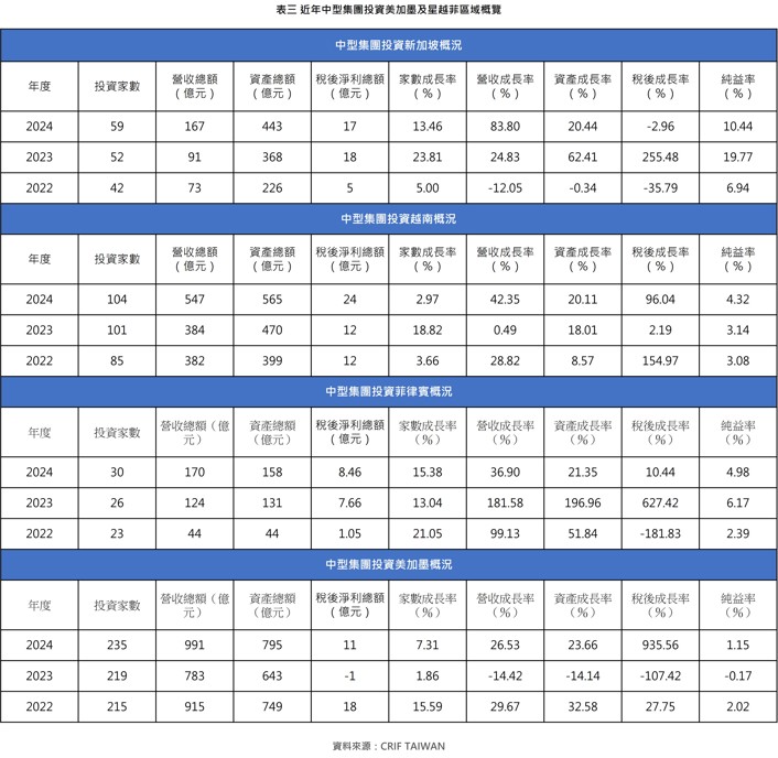 第三個關注點是東協爆發成長、星越菲各自亮眼(詳見下表三)。東協區域在投資家數、資產總額、營收總額、稅後淨利全數創十年新高,尤以營收成長率較其餘大區域更顯耀眼,中型集團隨東協區域總經格局勃發之外,檢視營收總額份額占比,可見星越菲占東協總額近七成。細部攤開各國表現,新加坡連續三年純益率高於東協全區,顯見星國是集團強化全球競爭力的戰略後盾;越南稅後成長率達96.04%顯示產能基地具備實質獲利能量;而投資菲國近三年獲利賺了八倍、菲律賓在2024年一躍成為東協旅客來台最大來源國(2025夏季台菲雙向互惠免簽證啟動),係中型集團能否在地緣政治夾縫、透過美日在呂宋經濟走廊三方協力,持續擴大東協區域利基的關注焦點。