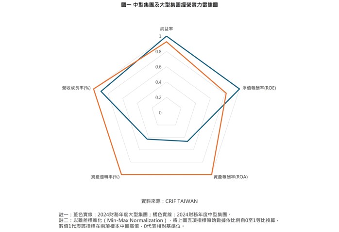 進一步解讀中型與大型集團總體經營績效核心數據,相較於大型集團在財務槓桿運用、規模經濟、品牌與供應鏈定價等優勢累積純益,中型集團在營收成長率、資產周轉率及ROA相對突出,說明中型集團快速因應市場、資產配置靈活的「高效與動能」帶動較高資產回報。中型集團身為市場的「追趕者」與「新創者」,雖然目前受限於規模使得純益率稍低,但其高週轉率帶動的極佳資源利用能力,隨目前成長節奏並優化成本控管,中型集團將具備更強的競爭潛力與利潤上修空間。透過經營績效比較說明集團調查重要性、產業變動性之外,「活力中型」不僅是未來躍上大型集團的主力,更證明秉持「產品為王」路線的台灣企業,為何備受國際供應鏈關注與合作締結。
