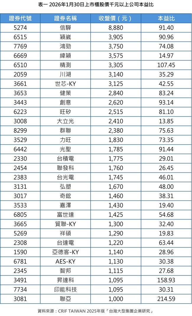 另一項不容忽視的現實是:台股加權指數位在高檔。自2025年4月11日的低點17306.97點起算,漲至2026年1月29日盤中的32996.03點,累計漲幅高達90.65%,指數居高時的風險意識不宜淡化。當大盤指數被壓抑時,今年台股可能更傾向由個股表現主導。若目前台股盤面的千元股大軍,能夠繼續上升,則市場信心可望維持;反之,領漲重心可能轉向目前股價在500-1000元之間的實質業績股。即在台股的選擇性相對有限的情況下,今年台股可望在比價概念下,催生出現更多的千元股。