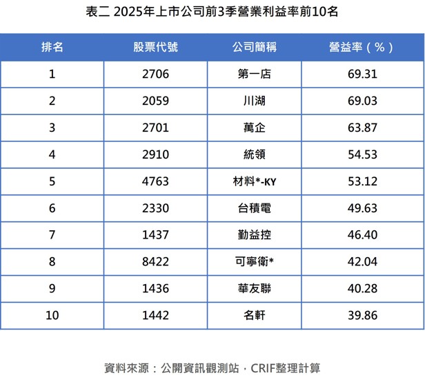 今年前3季營業利益率前10名的公司中,第一店(2706)以69.31%奪下榜首。川湖(2059)則以69.03%,僅些微之差位居第2名。萬企(2701)以63.87%排名第3;統領以54.53%列第4;材料-KY以53.12%居第5。台積電以49.63%名列第6;勤益控股以46.4%排名第7;可寧衛以42.04%居第8;華友聯以40.28%列第9;名軒則以39.86%位居第10。整體而言,營業利益率前10名多屬小型資產股及建設股,AI股相關企業僅有川湖與台積電入列(詳表二)。