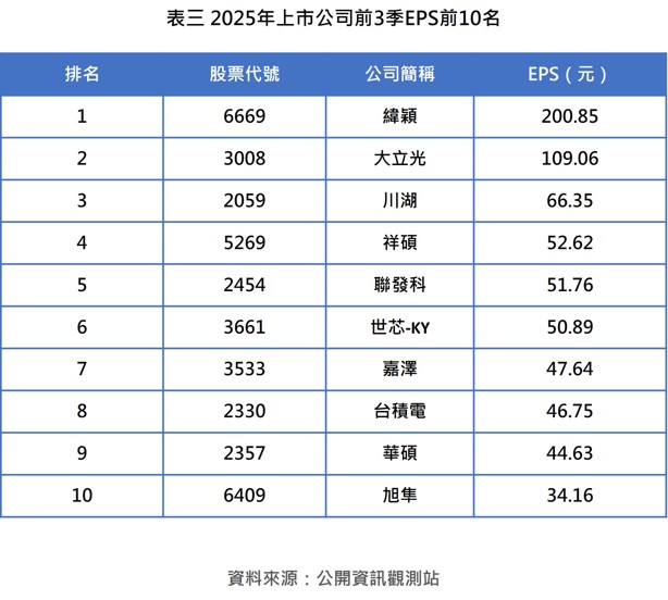 至於前3季EPS(每股盈餘)前10名,則由緯穎以200.85元摘下王座,並大幅領先以EPS109.06元居於第2的大立光(3008)。第3名至第6名EPS也都超過50元,依次為川湖的66.35元,祥碩(5269)的52.62元、聯發科的51.76元,以及世芯-KY(3661)的50.89元。EPS第7至第10名依次則為嘉澤(3533)的47.64元、台積電的46.75元、華碩的44.63元,以及旭隼(6409)的34.16元。整體觀察,前10名中除大立光之外,其餘均為AI相關股(詳表三)。