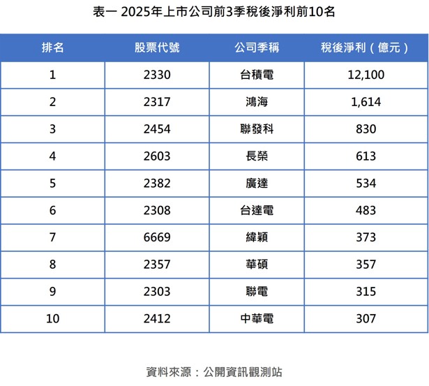 今年前3季稅後淨利第7至第10名依次為緯穎373億元、華碩357億元、聯電315億元及中華電約307億元。其中,緯穎與華碩均創下前3季獲利歷史新高。整體而言,前3季獲利前10大的企業中有6家締造獲利新高紀錄,且皆屬AI相關股(詳表一)。